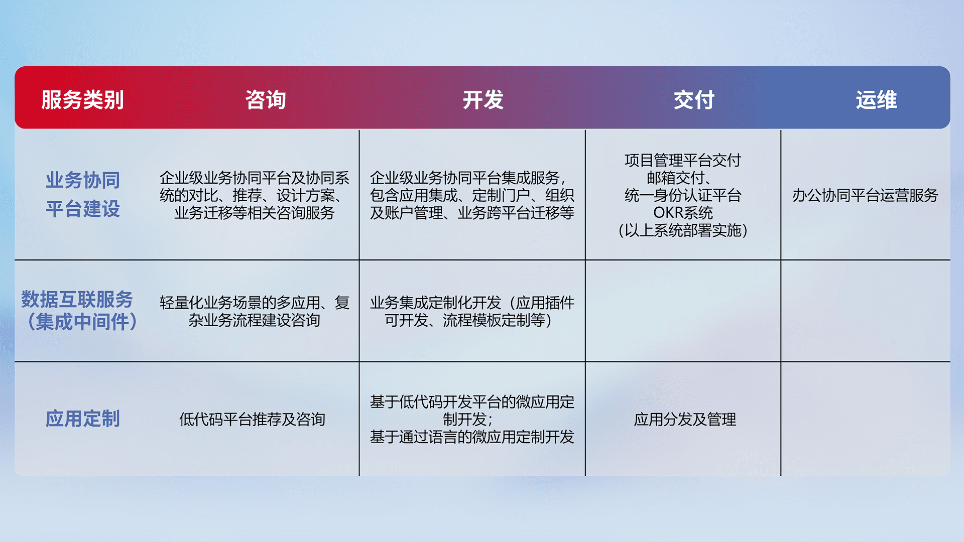 针对钉钉、、、、企微、、、IDaas等平台级产品提供产品的规划、、方案、、、、交付、、、定制化开发等服务,,,,实现如统一协同办公、、智能客户服务、、、混合会议管理、、智能数据查询、、等业务场景,,,实现数字化转型。。。。